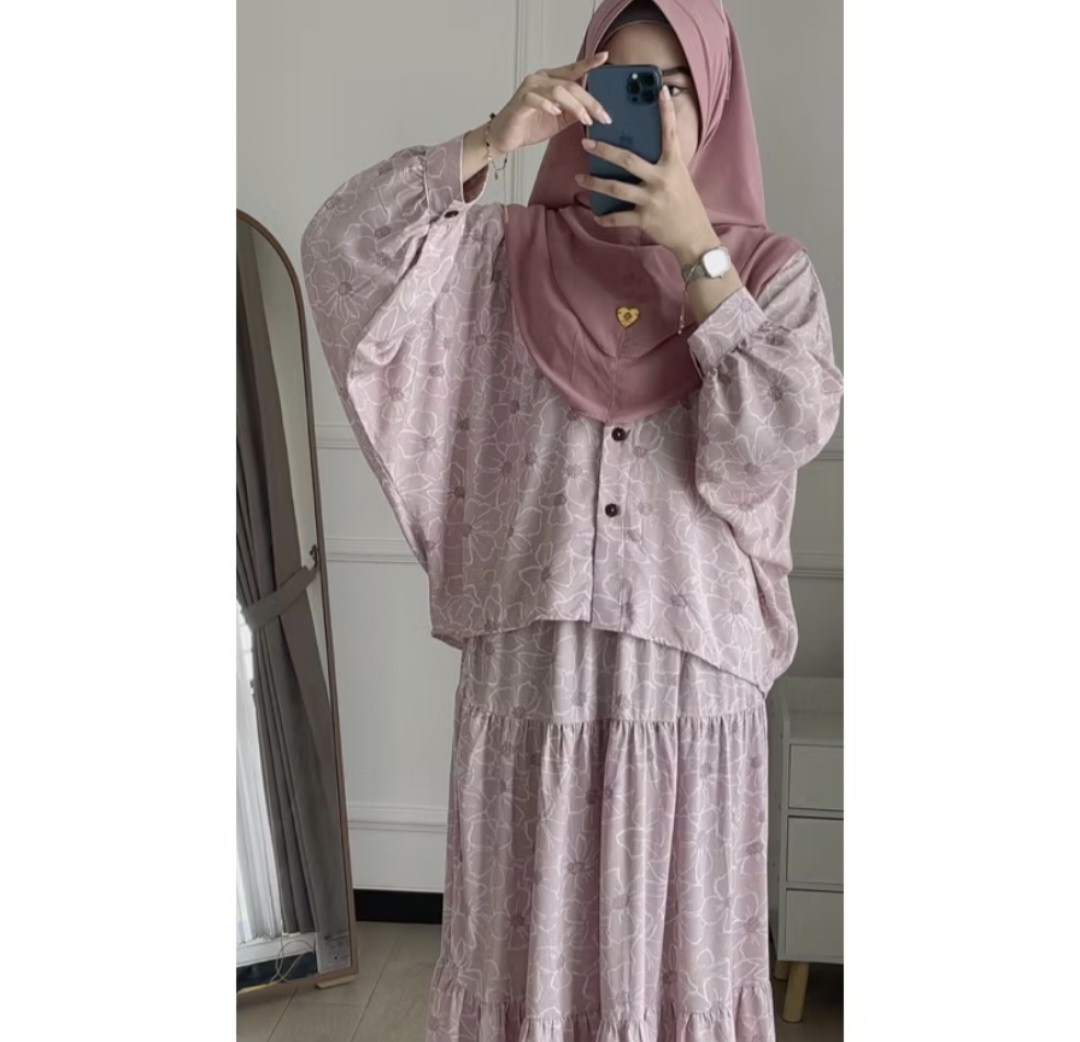 A comfortable, soft, and cool rayon cotton blouse set for a daily look. It features button details on the sleeves and a pretty skirt. It comes in girly and cute colors.