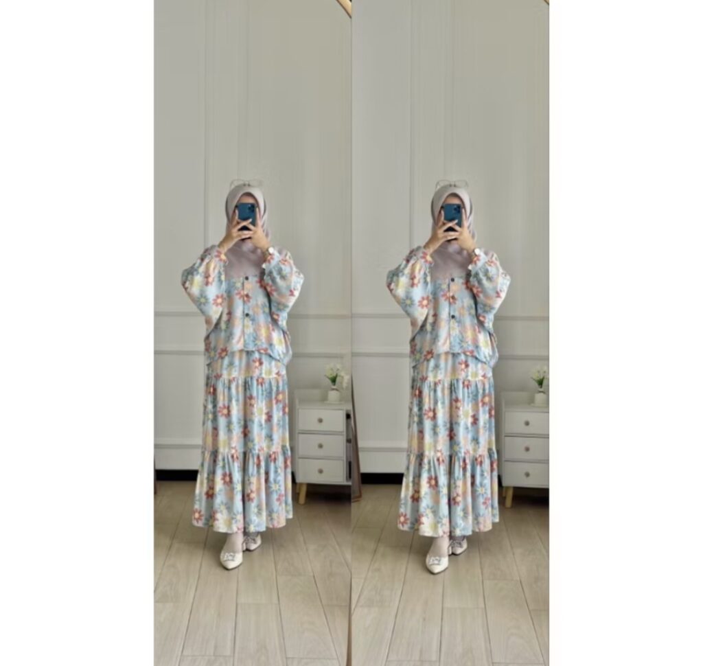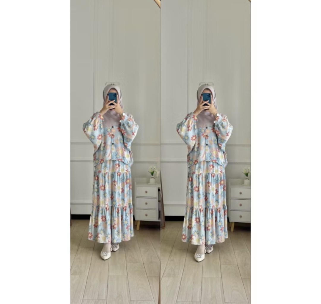 A comfortable, soft, and cool rayon cotton blouse set for a daily look. It features button details on the sleeves and a pretty skirt. It comes in girly and cute colors.