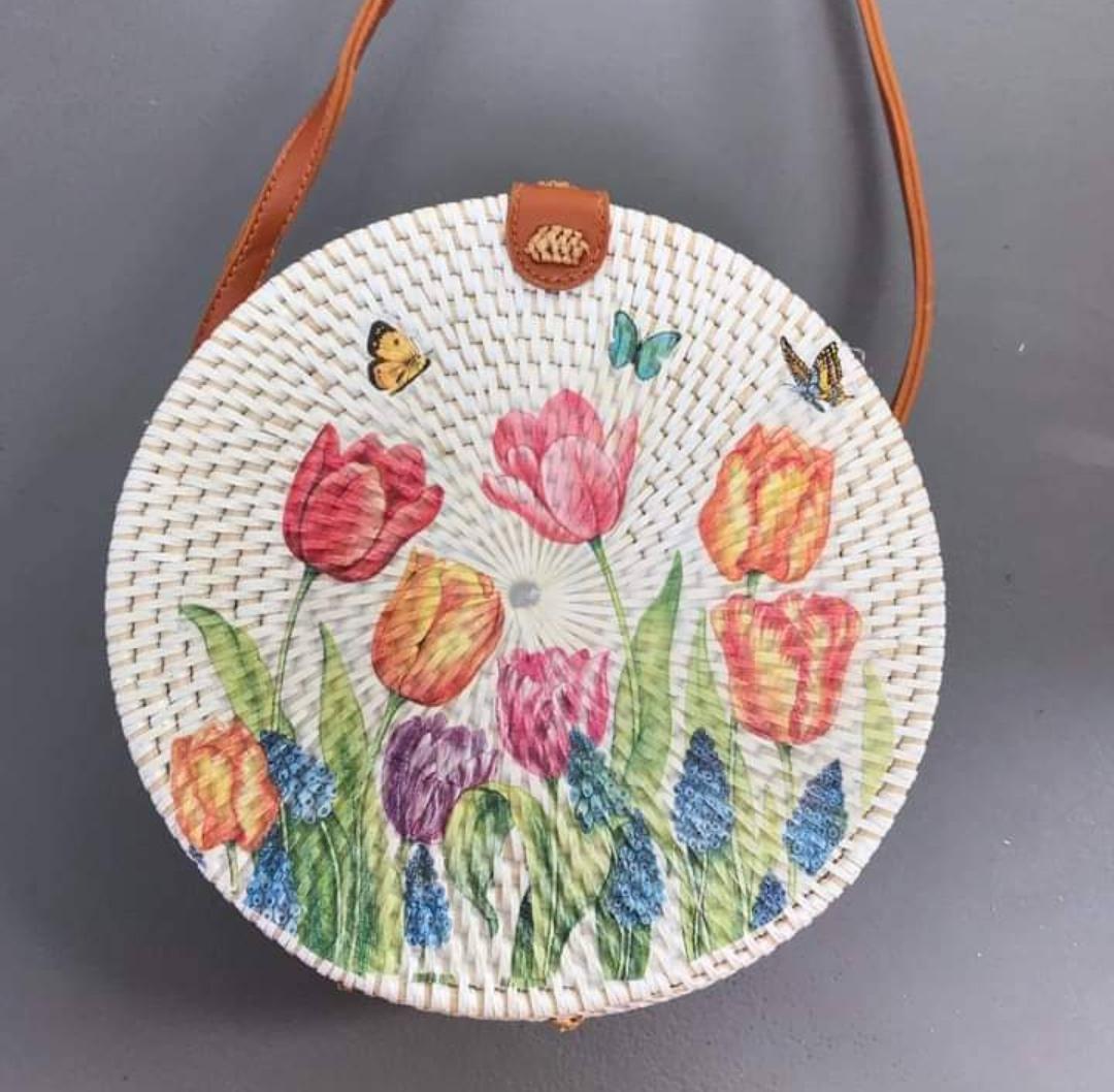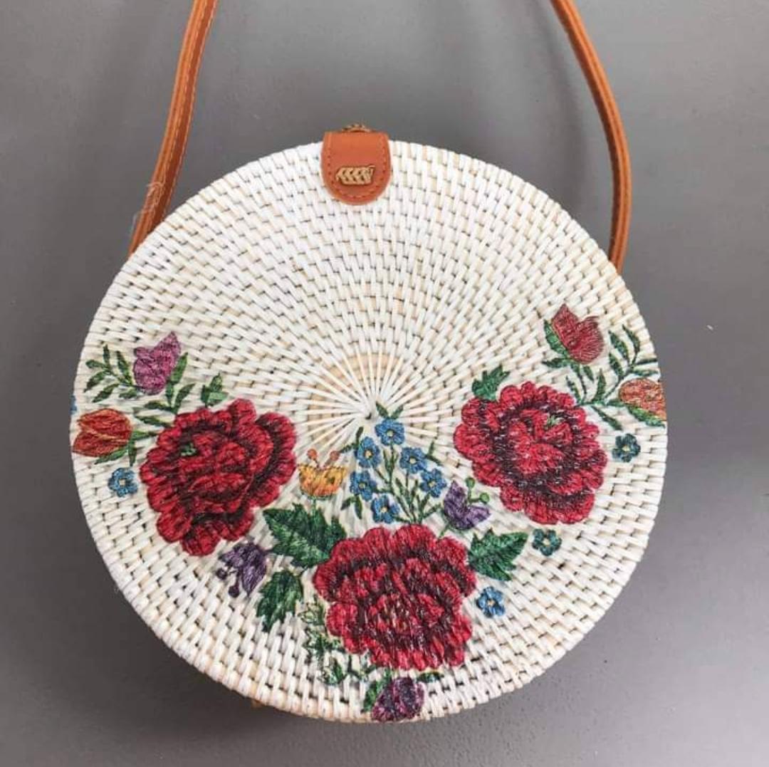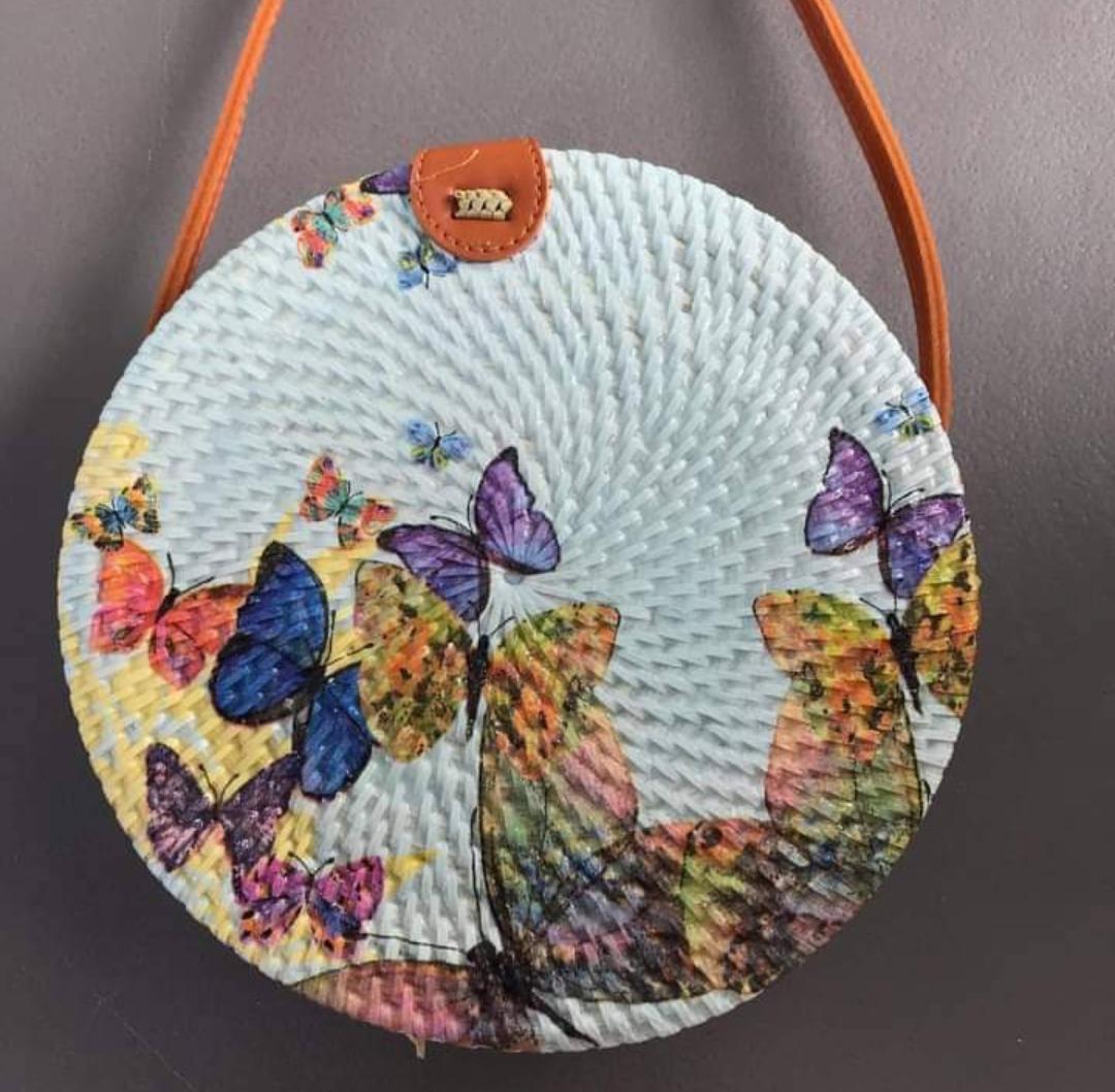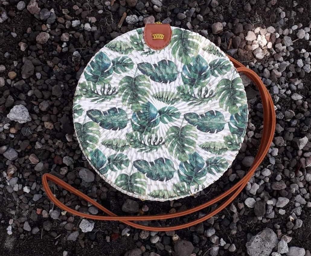 Add a touch of nature-inspired elegance to your outfit with this handcrafted round bag. Featuring a stunning arrangement of pressed leaves in shades, this piece combines artistry with functionality. The woven outer frame and leather strap create a rustic yet stylish look, perfect for casual outings, vacations, or special occasions.