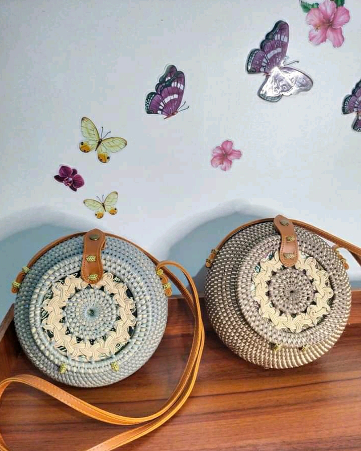 Add a touch of nature-inspired elegance to your outfit with this handcrafted round bag. Featuring a stunning arrangement of pressed leaves in shades, this piece combines artistry with functionality. The woven outer frame and leather strap create a rustic yet stylish look, perfect for casual outings, vacations, or special occasions.