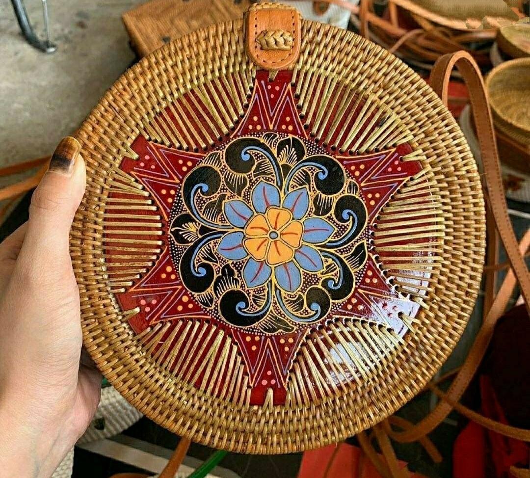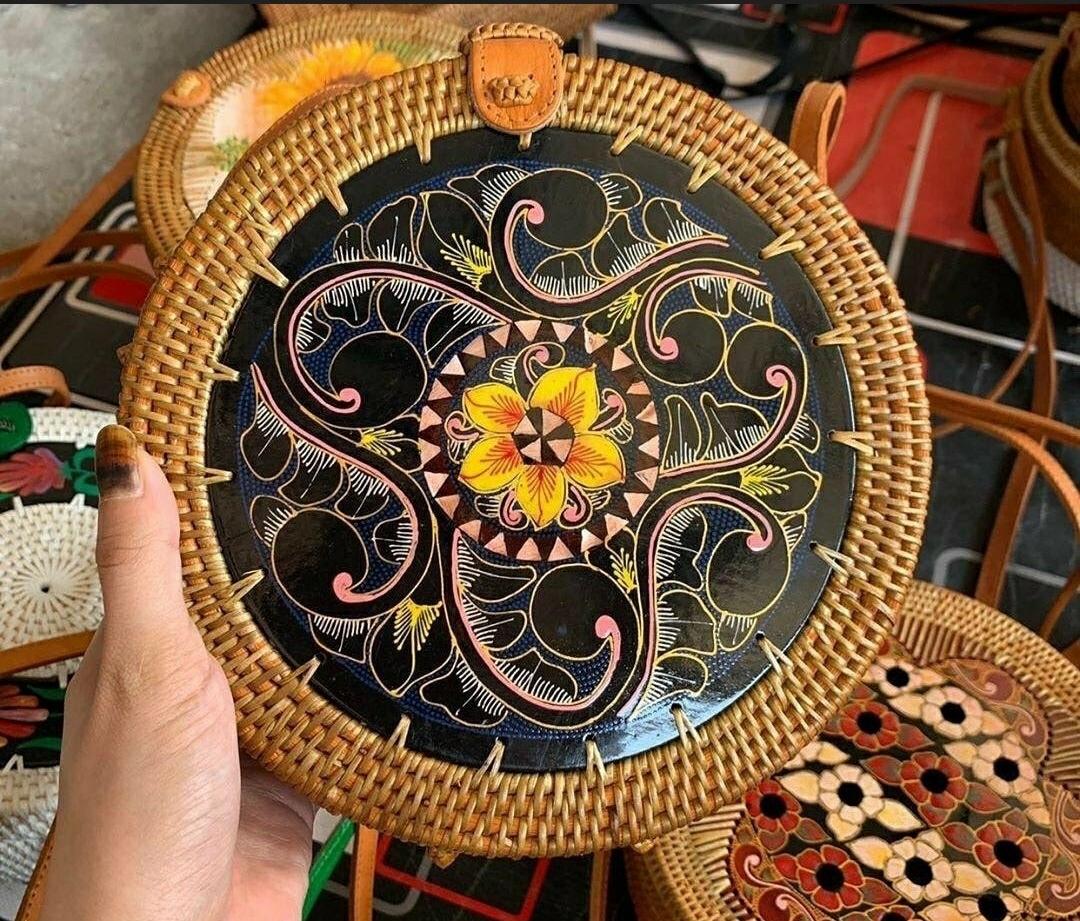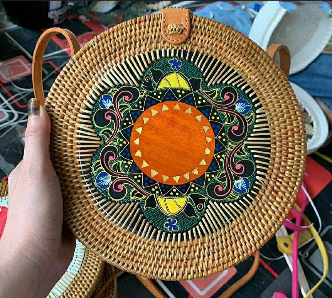 Add a touch of nature-inspired elegance to your outfit with this handcrafted round bag. Featuring a stunning arrangement of pressed leaves in shades, this piece combines artistry with functionality. The woven outer frame and leather strap create a rustic yet stylish look, perfect for casual outings, vacations, or special occasions.