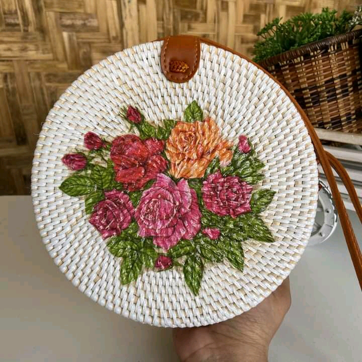 Balinese Rattan Round Bag Featuring a Printing Rose designBalinese Rattan Round Bag Featuring a Printing Rose design