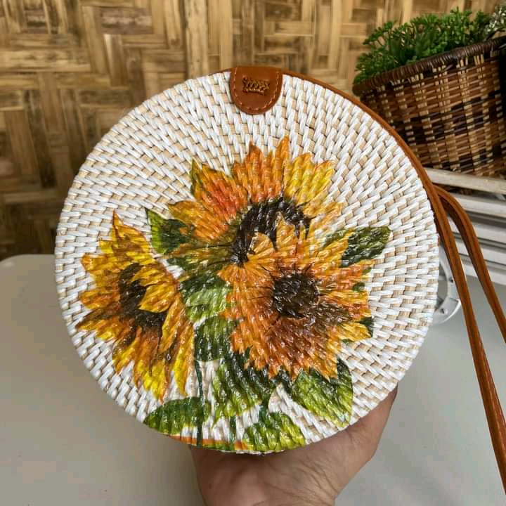 Balinese Rattan Round Bag Featuring a Printing sunflower designBalinese Rattan Round Bag Featuring a Printing sunflower design