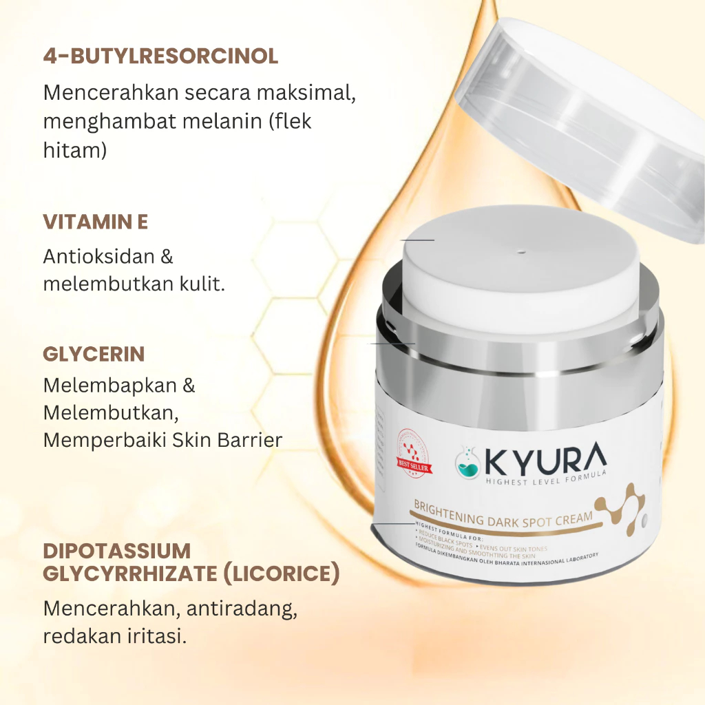 Kyura Brightening Dark Spot Cream — A black spot & face blemish removal cream with the best brightening formula. Safe, BPOM, and suitable for all skin types.