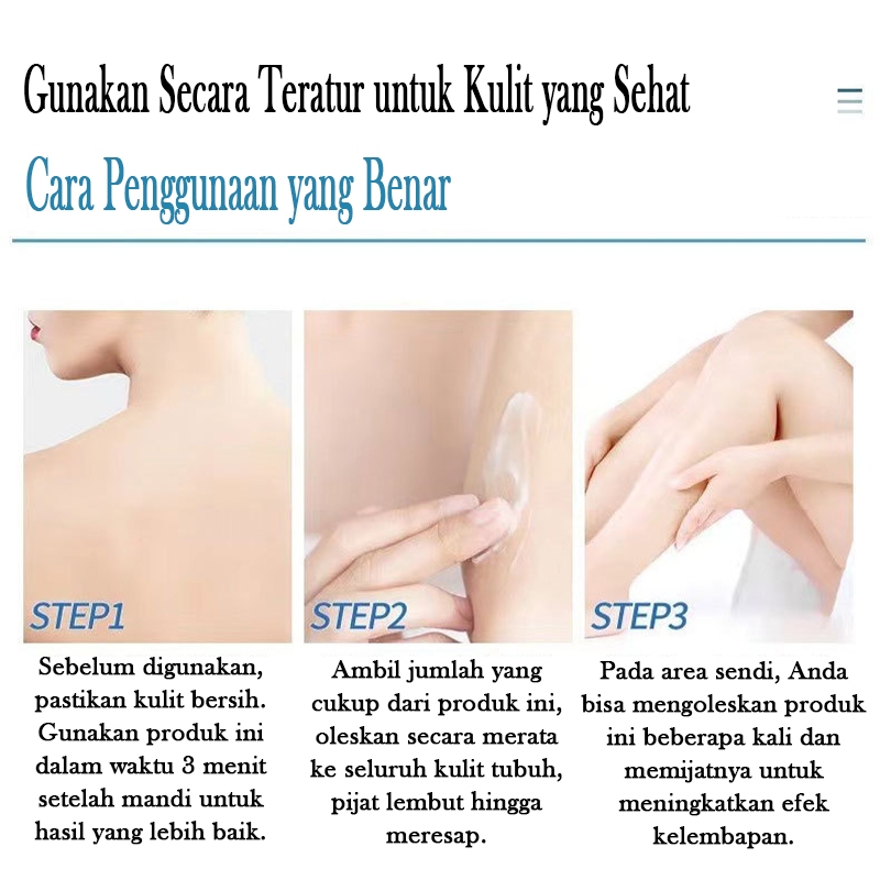 ✅Sebelum digunakan, pastikan kulit bersih. Gunakan produk ini dalam waktu 3 menit setelah mandi untuk hasil yang lebih baik.Ambil jumlah yang cukup dari produk ini, oleskan secara merata ke seluruh kulit tubuh, pijat lembut hingga meresap.Pada area sendi, Anda bisa mengoleskan produk ini beberapa kali dan memijatnya untuk meningkatkan efek kelembapan. ✅