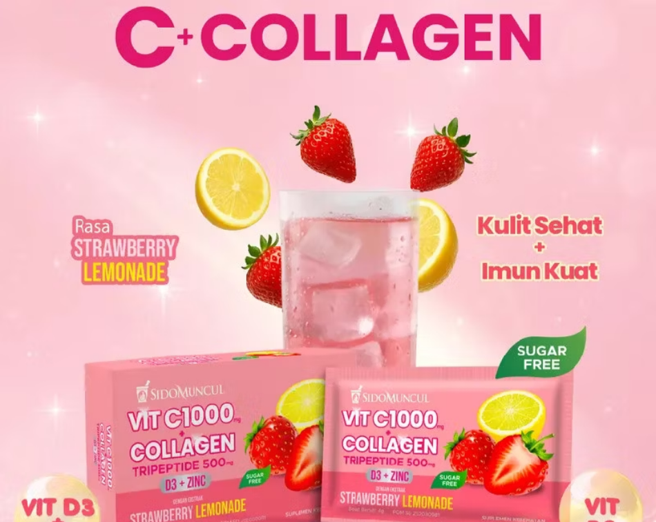Sido Muncul C+Collagen Strawberry Lemonade is a functional powdered drink that combines 1000 mg of vitamin C, 500 mg of collagen tripeptide, vitamin D3, and zinc. Designed to boost immunity and promote skin elasticity (glow), this product is safe for daily consumption because it is sugar-free.