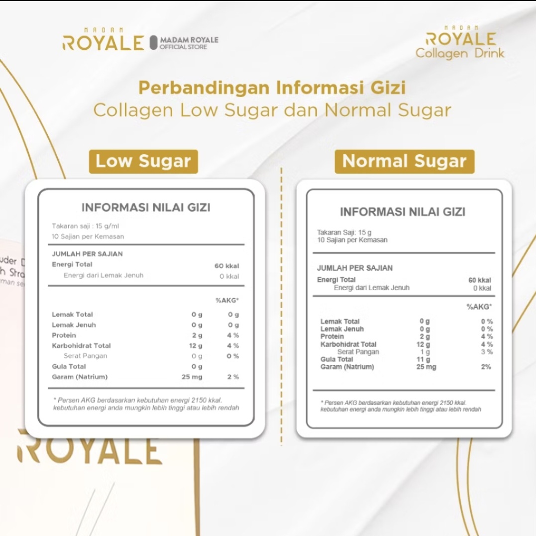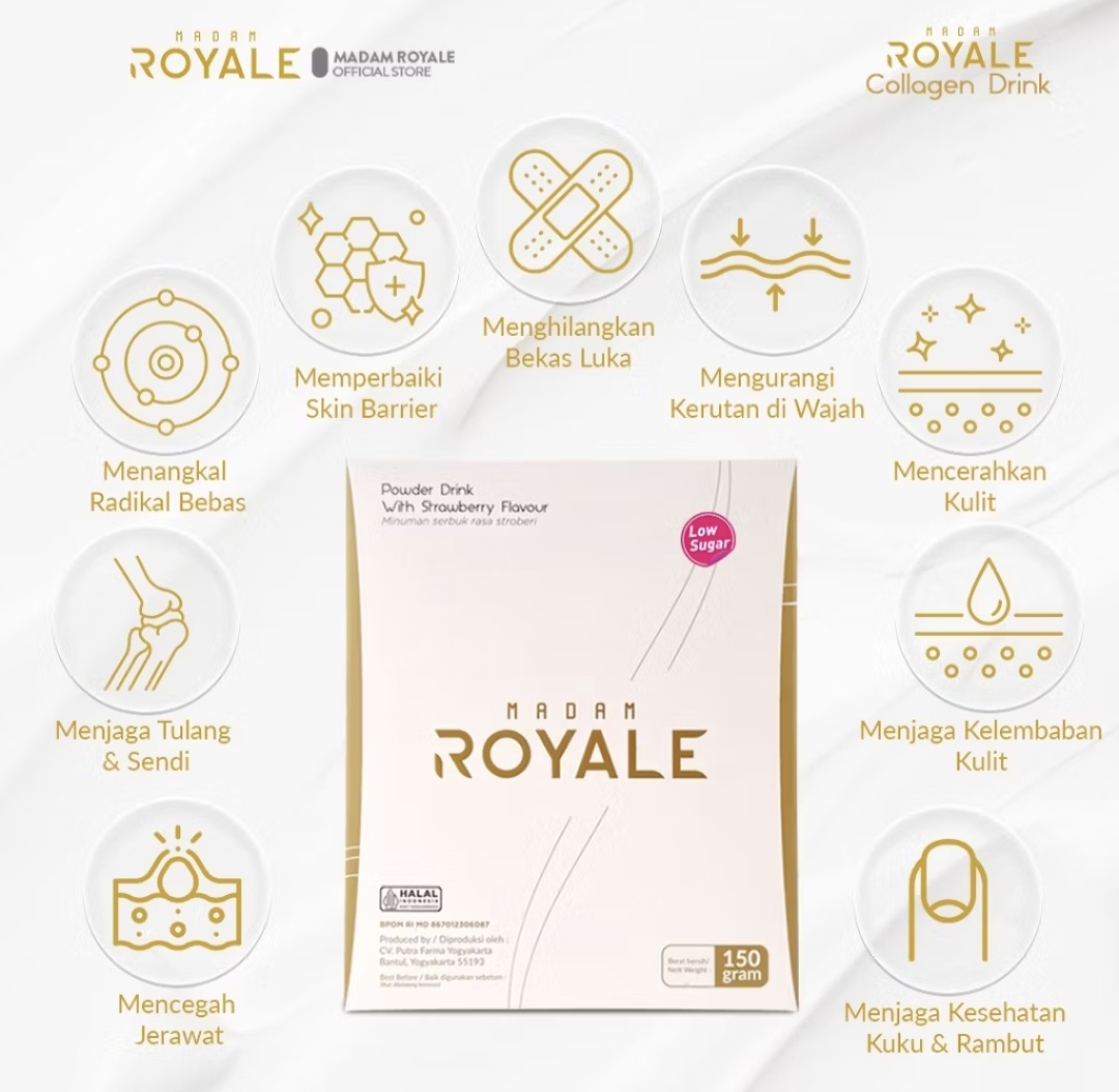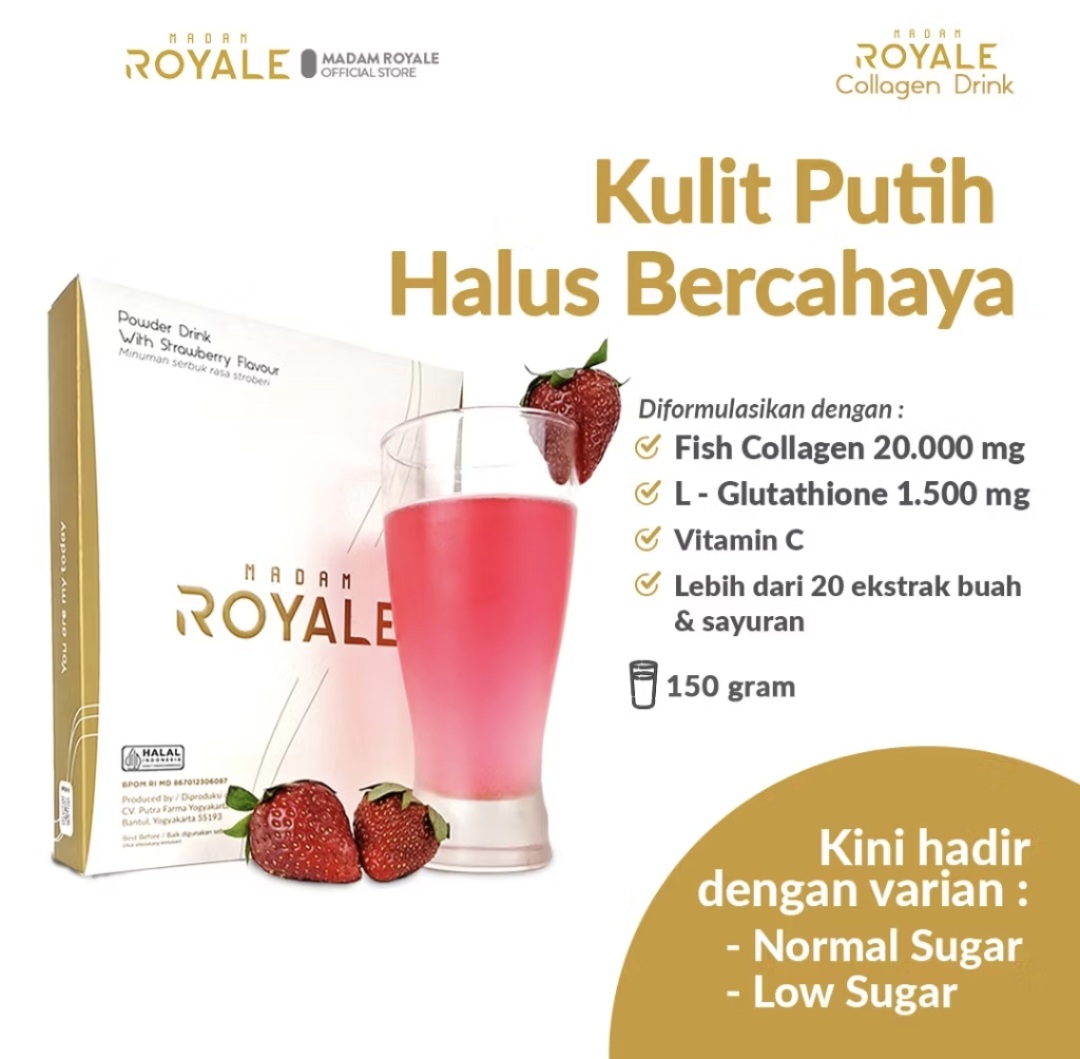 Madam Royale Collagen Drink is a strawberry-flavored powdered drink containing fish collagen, strawberry extract, fruit and vegetable extracts, L-glutathione, and inulin, which are excellent for protecting skin tissue from free radicals and preventing premature aging. Furthermore, these ingredients are also effective in boosting overall health, preventing various minor and serious health risks.