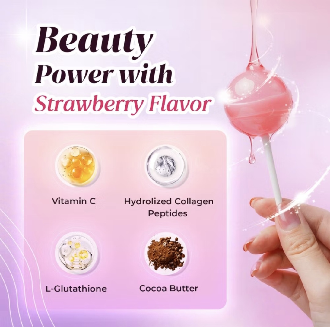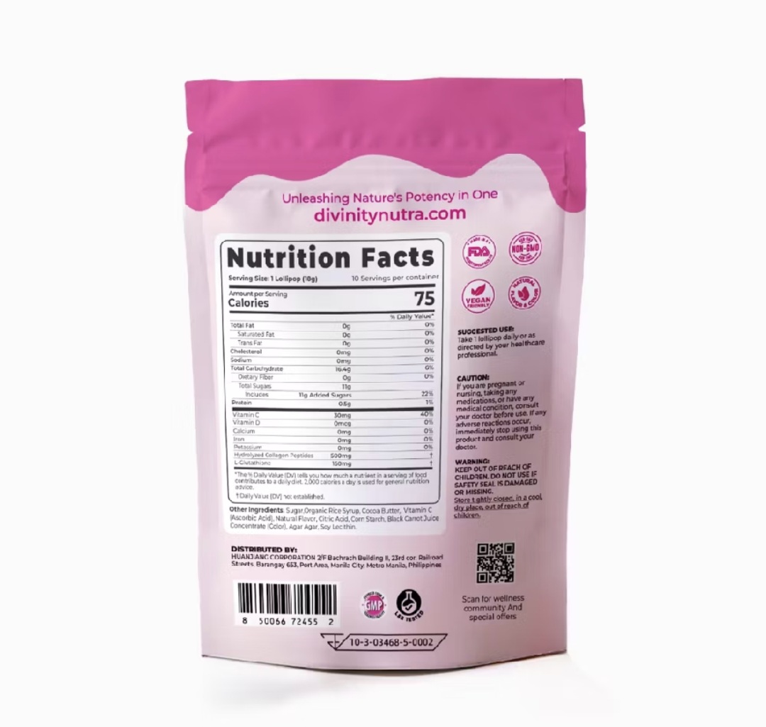 Enriched with 150mg of L-Glutathione to support the body’s natural defenses and brighten skin. [Beauty & Health in Every Lollipop] Contains 500mg of Hydrolyzed Collagen Peptides to maintain skin elasticity and joint health.