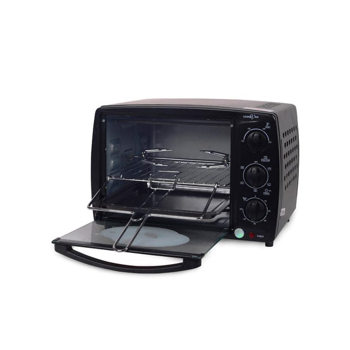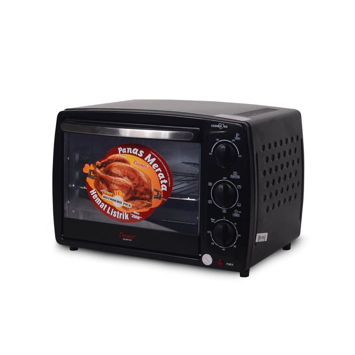 Cosmos Oven with a capacity of 19 liters for baking various dishes such as cookies, roast chicken, etc. Equipped with Bbq Rotisserie Pick (Automatic Rotating Grill). Stainless Steel Heating Elements That Can Conduct Heat From All Directions. Easy to Clean and Use. With 6 Heating Element Options. There are 2 Shelves (Cake Rack & Iron Rack) Inside. And Timer Control Up to 60 Minutes, 350w + 350w Electric Power. There is also a “Stay On” Mode So It Makes It Easy to Bake According to Your Needs.