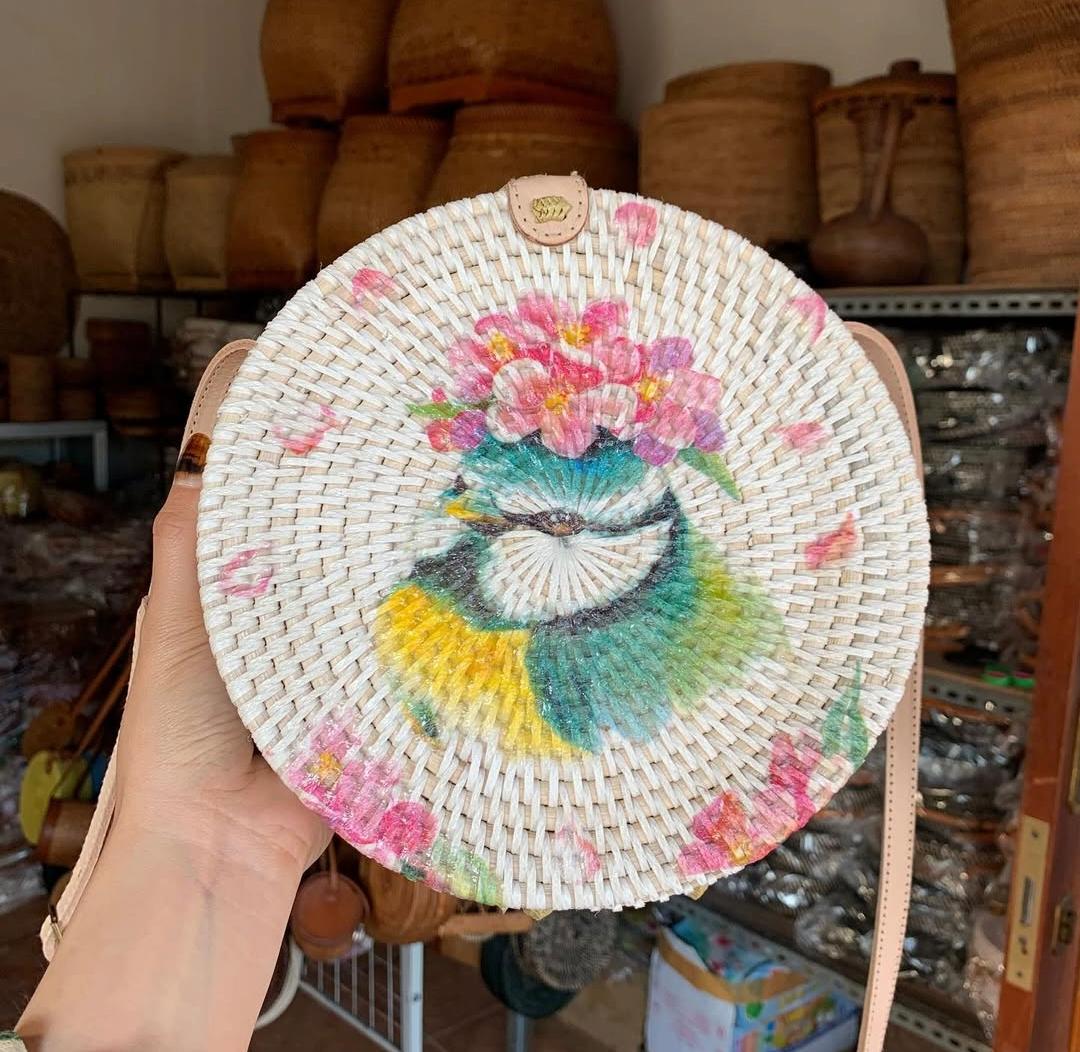 Handmade Rattan Round Bag with Printing Design
