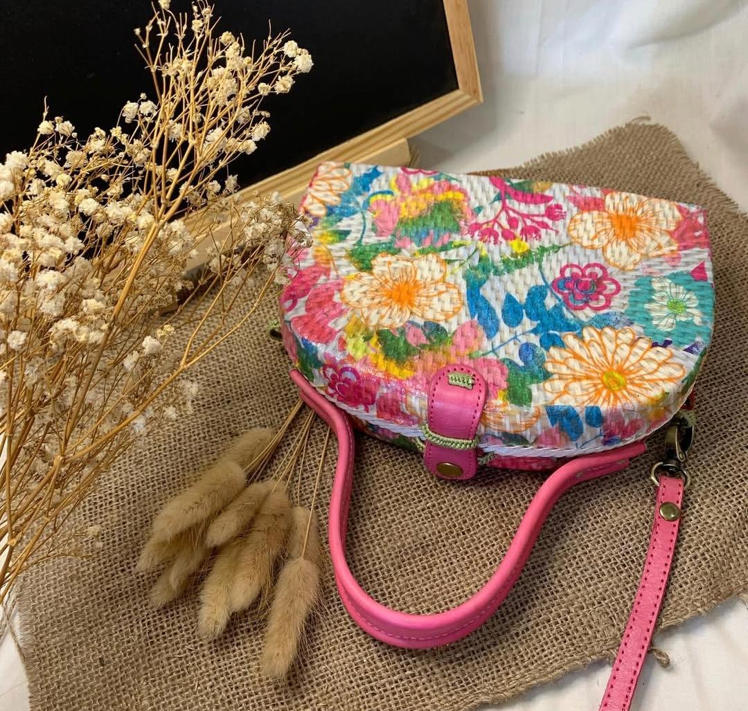 Add a touch of nature-inspired elegance to your outfit with this handcrafted round bag. Featuring a stunning arrangement of pressed leaves in shades, this piece combines artistry with functionality. The woven outer frame and leather strap create a rustic yet stylish look, perfect for casual outings, vacations, or special occasions.