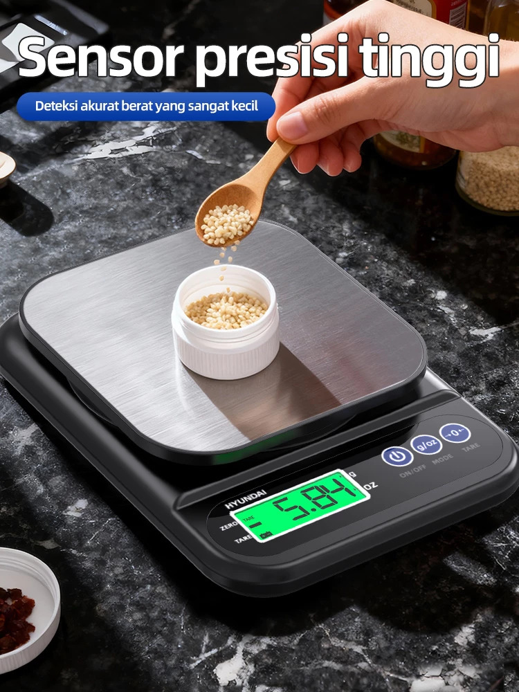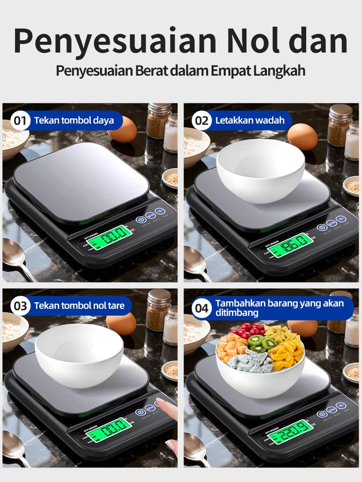 STEP 1: put the kitchen scales on a hard, flat surface; STEPS 2: Press the “ON/OFF” button, the scales will display zero in 3 seconds.STEP 3: put the object to be weighed into the container, the weight will appear on the screen.