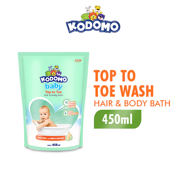 Practical packaging of baby bodywash & shampoo, clinically tested to be gentle on baby’s skin. With a no more tears formula (does not sting the eyes) containing Aloe Vera & Wheat Germ Oil to maintain the natural moisture of baby’s skin. With a balanced pH and hypoallergenic, it is suitable for sensitive baby skin. Vitamin E & Pro Vit B5 nourishes baby’s hair to keep it healthy & shiny. Kodomo Top To Toe Hair & Body Bath gently cleanses from head to toe.