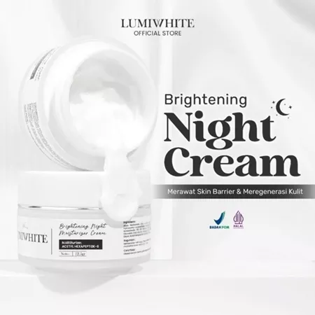 Lumiwhite Brightening Night Moisturizer Cream is enriched with Acetyl Hexapeptide 8 which is able to repair damaged Skin Barriers, increase skin hydration, reduce wrinkles and as an anti-aging. Keeps skin looking younger, smoother and healthier. It is formulated with Niacinamide and Mars Moisturizer ingredients that are able to control excess oil production, brighten the face and regenerate facial skin, so that the face looks radiant and moisturized.
