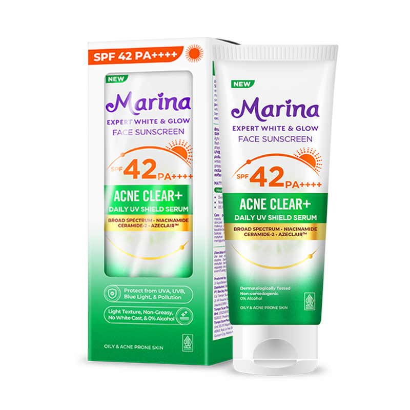 Marina Expert White & Glow Daily UV Shield Face Sunscreen SPF 42 PA++++ with a light texture easily permeates protecting the skin from UVA, UVB, Blue Light, and pollution without leaving white cast, sticky, and oily taste. Healthy skin shines, brightens, and smooth.