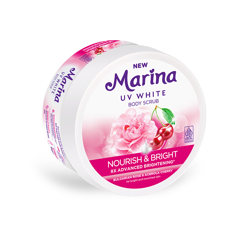 Just! Marina UV White Healthy & Glow Body Scrub with 8X Advanced Brightening. Soft scrub granules help remove dirt & dead skin cells, making the skin clean, smooth and bright blush.