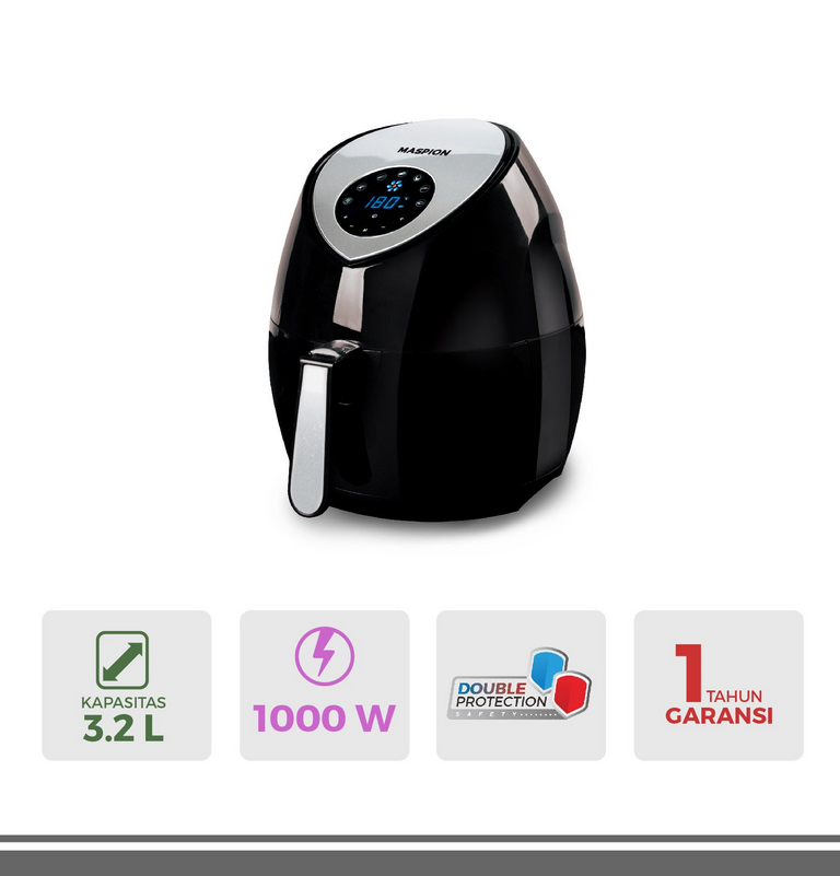 FEATURES Capacity: 3.2 L Wattage: 1000 W Voltage: 220 V Dimensions: 32.5 x 32.5 x 35.2 cm Frying without oil Heat: 80 – 200 C Timer: 0-60 minutes Warranty: 1 Year