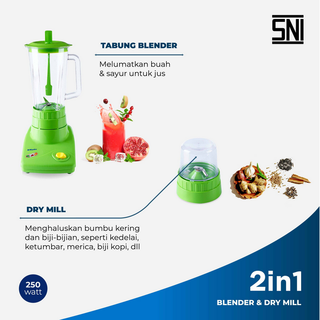 Blender Miyako BL-301 GS G has a 2 in 1 function. Equipped with a 1-liter-capacity blender tube that makes it easier for you to make a variety of juices, as well as an additional 1 dry mill tube that serves to smooth seasonings – dry seasonings such as coriander, pepper and so on. An on/off button that is easy and very practical to use with power consumption of only 250 Watts. Blender Miyako BL-301 GS G has also obtained an SNI certificate so that it is guaranteed safety and quality.