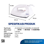 Irons are equipped with a temperature controller to adjust the temperature according to the needs and indicator of the lamp that indicates the iron is ready for use. The shape of the striated base makes ironing activities easier especially for difficult parts such as collars, buttons and folds of clothes. Ergonomic handles make ironing activities more comfortable and SNI standards that maintain product security.