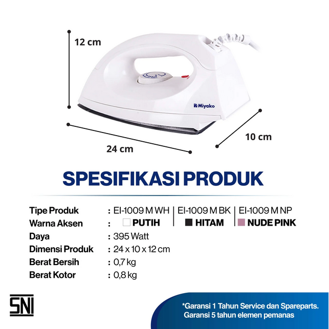 Miyako Electric Irons are coated with Ceramic Coating on its ironing base so that it is suitable for ironing any rough jeans without fear of being scratched, more slippery, non-stick and more scratch-resistant. Rubber Compound and double insulation that protects the cable so that the cable is heat resistant, more durable and flexible.