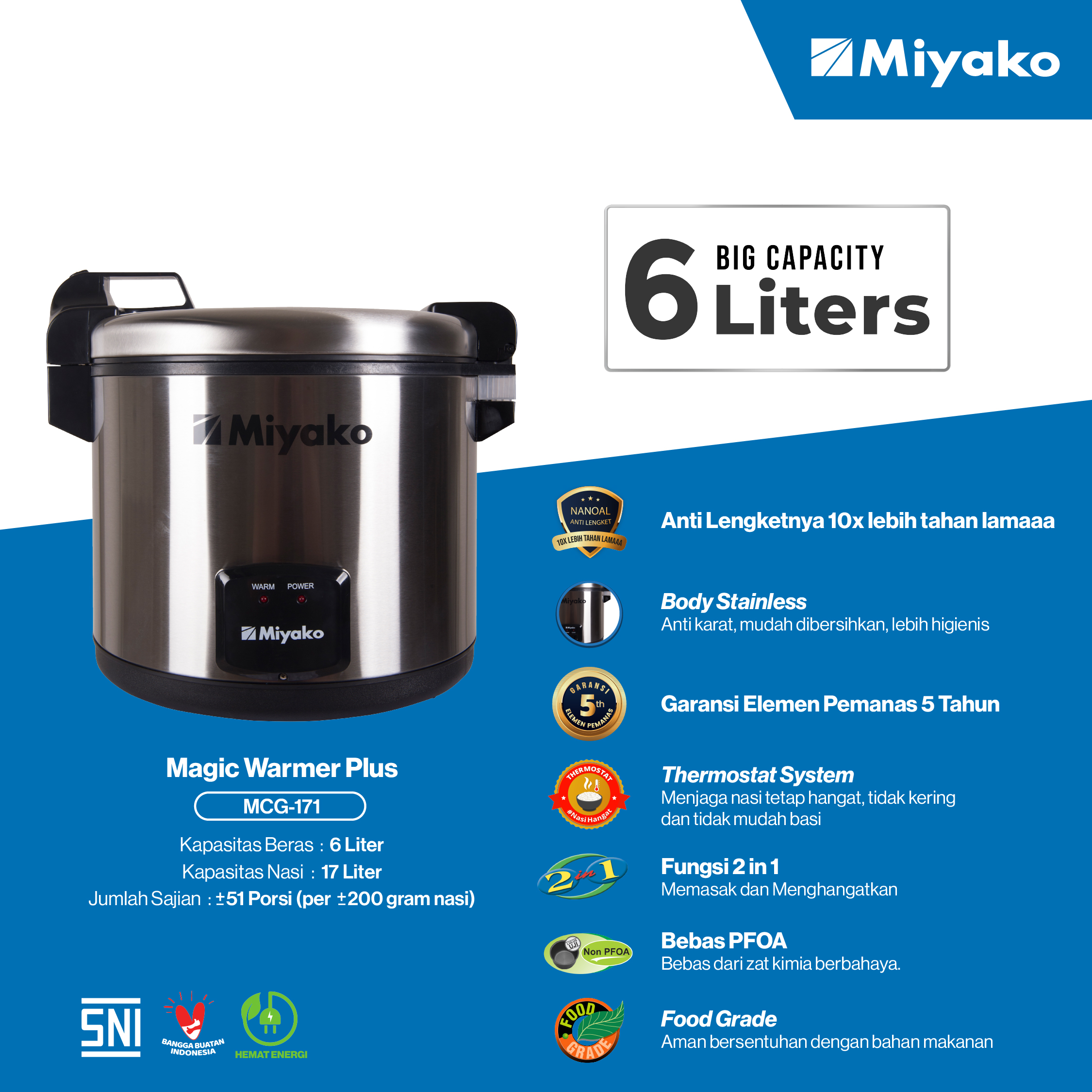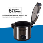MCG-171 has a cooking capacity of up to 6 liters of rice (Super Big) and warms up to 17 liters of rice with a serving of up to 51 servings of rice (tapose 200 grams per serving).