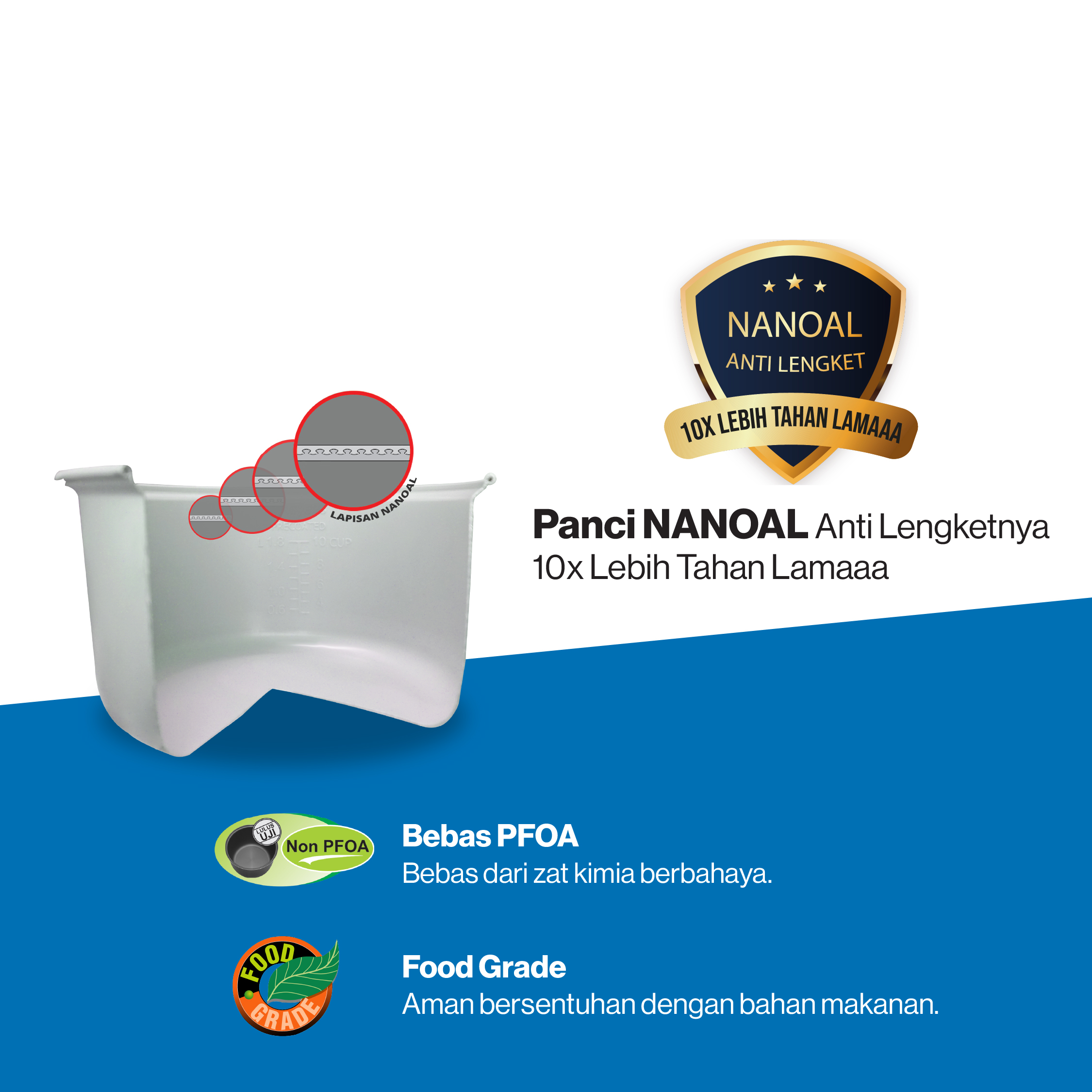 The Miyako MCG-171 Rice Cooker has a Nanoal Pan that is 10x more durable. Miyako Nanoal Pan is processed with etching techniques.Make the non-stick coating soak in the aluminum pores so that its non-stick is more durable and durable and provides a smoother surface and easier to clean. The Nanoal pan has also passed the food grade test and is certified free of harmful Perfluorooctanoic(PFOA)acidic chemicals.