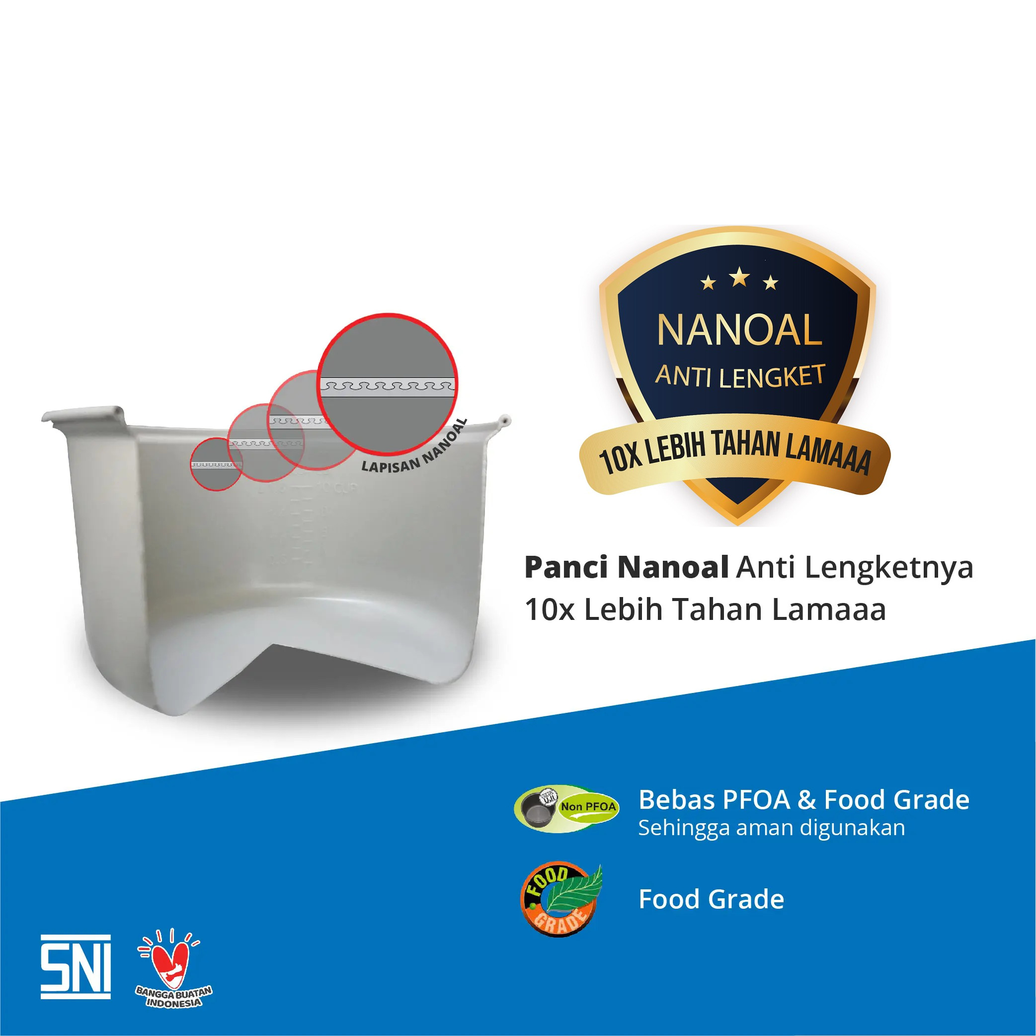 Rice Cooker Miyako MCM-507 SBC has a Nanoal Pan that Anti-stick Is 10x Durable. Miyako Nanoal Pan is processed with etching techniques.Make the non-stick coating soak in the aluminum pores so that its non-stick is more durable and durable and provides a smoother surface and easier to clean. The nanoal Miyako pan has also passed the food grade test and is certified free of harmful Perfluorooccanotoxicacid (PFOA).