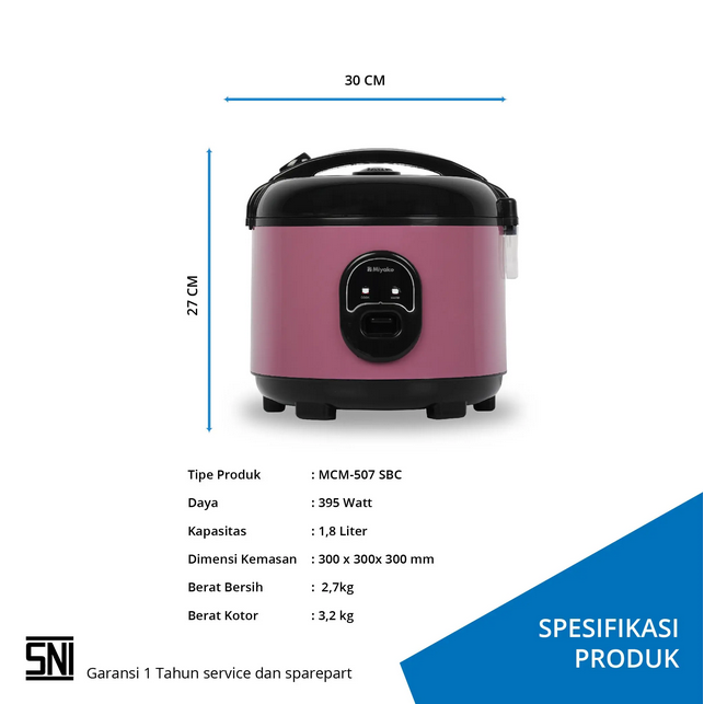 Rice Cooker Miyako MCM-507 SBC wrapped in anti-rust body and Red Purple colored anti dent with elegant Black combination. In addition, MCM-507 SBC has a 3 in 1 Function that is very practical to use for cooking and warming and steaming.