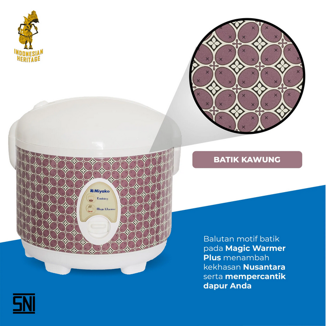 Is a rice cooker with a beautiful batik motif Typical of Indonesia. This type has a pattern of batik kawung that will beautify your kitchen. It has a function of 3 in 1 that is as a rice cooker, steaming, and warm food. The inner pot made of high quality material makes it anti-stick, not easily scratched and very easy to clean. It has 3 heating elements at the top, middle and bottom that make the rice ripen more perfectly and hold warmer for longer.