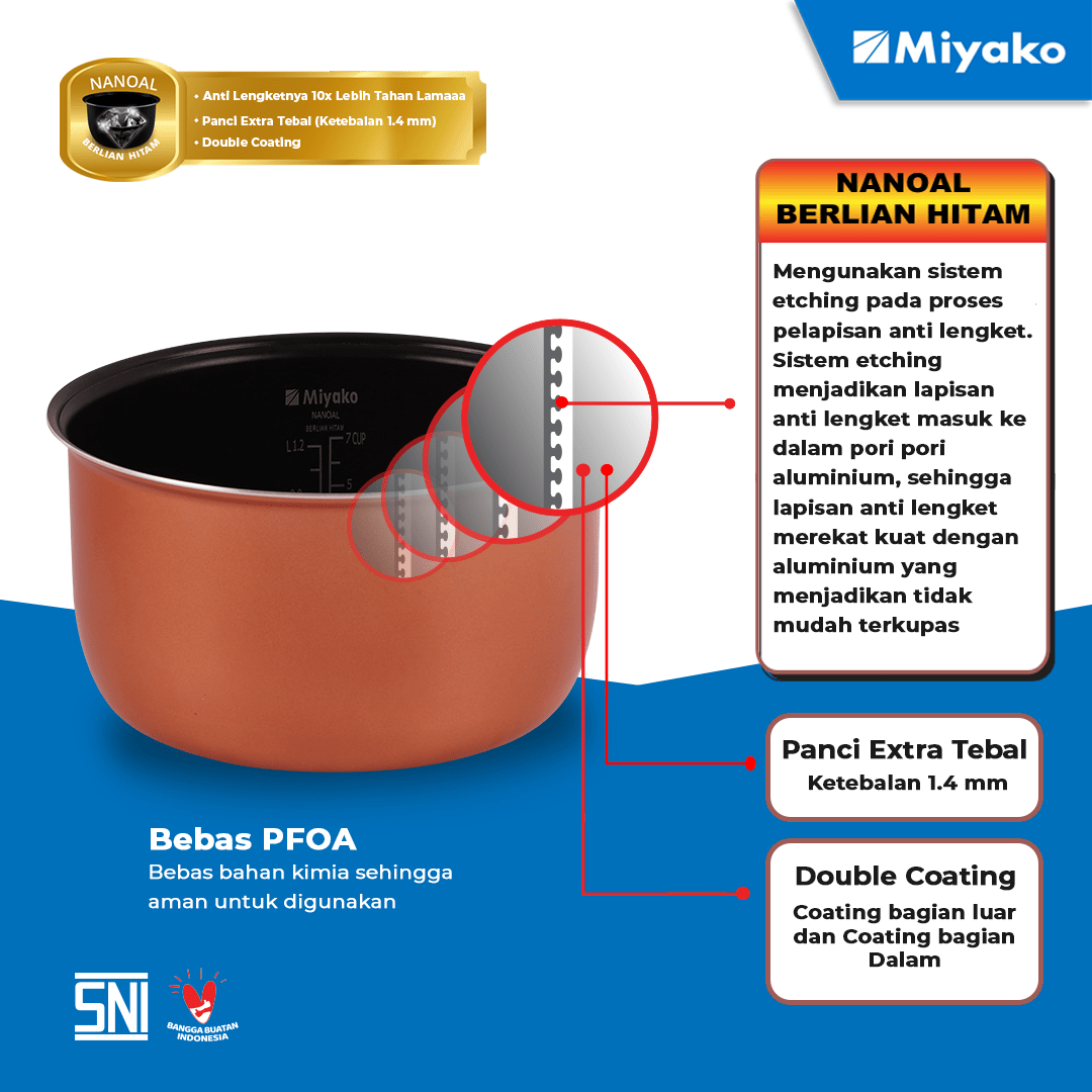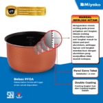 Rice Cooker Miyako MCM-512C BH has a Black Diamond Nanoal Pan that is 10x more durable, thicker with a thickness of 1.4 mm, as well as a Double Coating coat on the inner and outer surface of the pan. Make the pan look more luxurious and elegant. Miyako’s Black Diamond Nanoal Pan is also processed with etching technology. Makes its non-stick coating seep into the pores of aluminum, making its non-stick more durable and durable, and provides a smoother surface, and easier to clean.