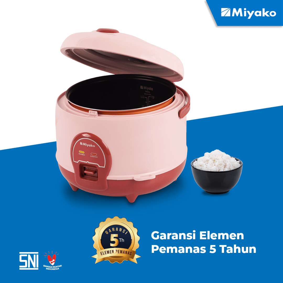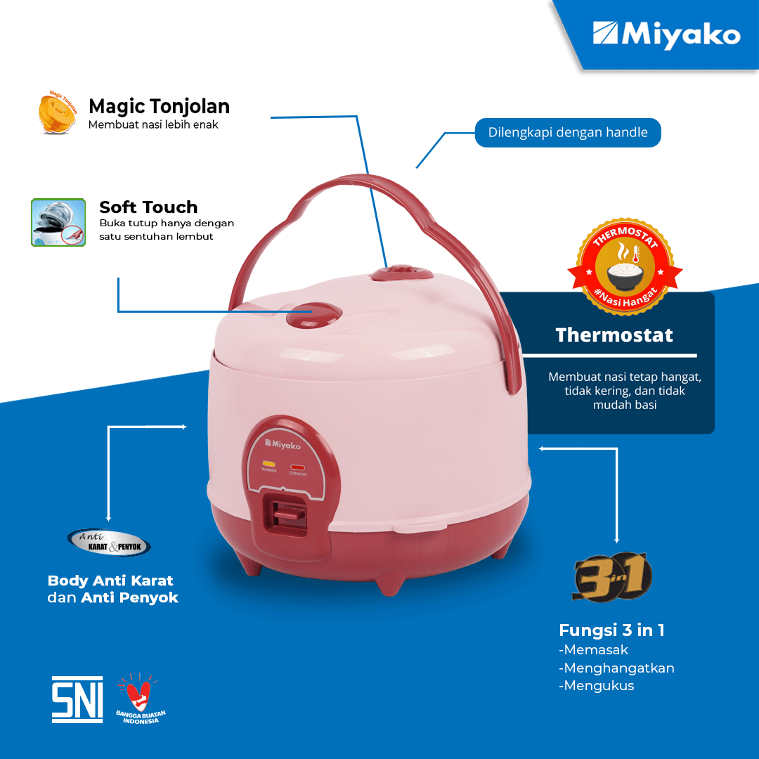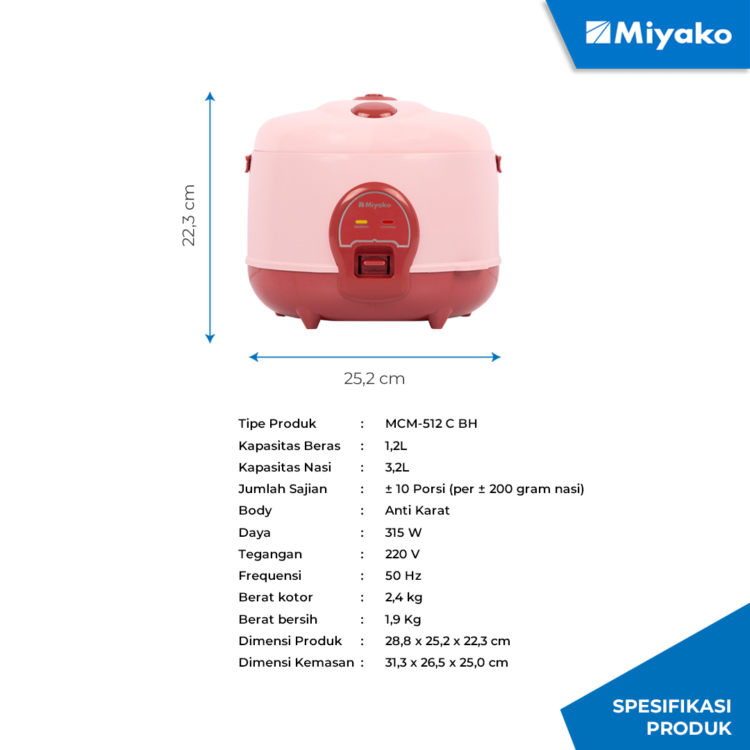 Rice Cooker Miyako MCM-512C BH clad in anti-rust body and Pink anti-smooth with Maroon accent. Equipped with Soft Touch Opening feature that has a function to make it easier to open the lid of the rice cooker with one soft touch. In addition, MCM-512C BH has a capacity of up to 1.2 liters of rice and warms 3.2 liters of rice with 10 servings of rice (rain 200 grams per serving).