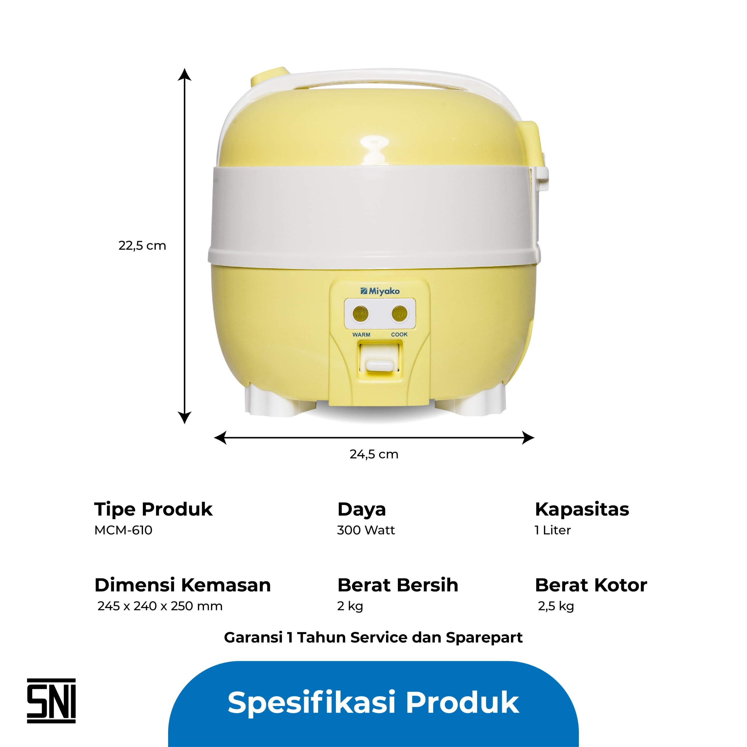 Rice Cooker Miyako MCM-610 is wrapped in a body made of anti-rust and anti-smooth bright yellow. In addition, MCM-610 has a capacity of 1 liter of rice and warms 2.2 liters of rice. Able to serve up to 7 servings of rice (with a dose of 200 grams per serving).
