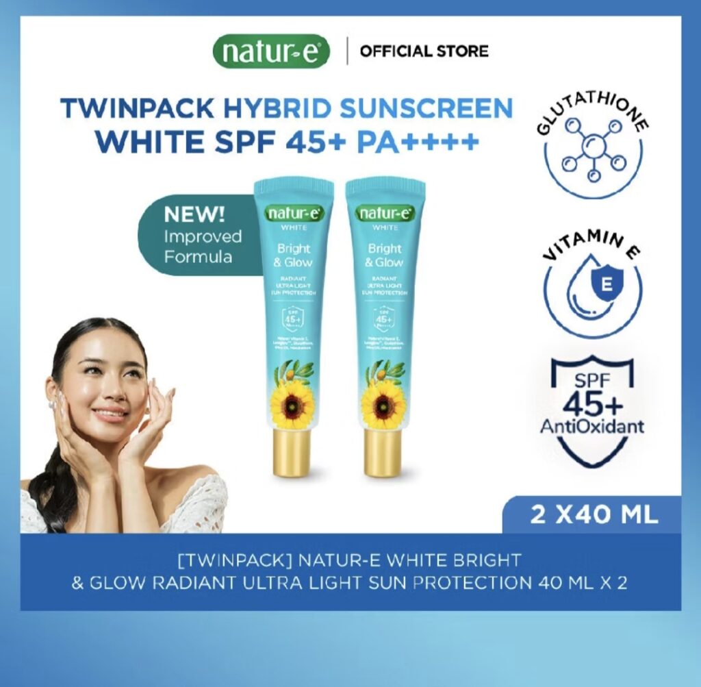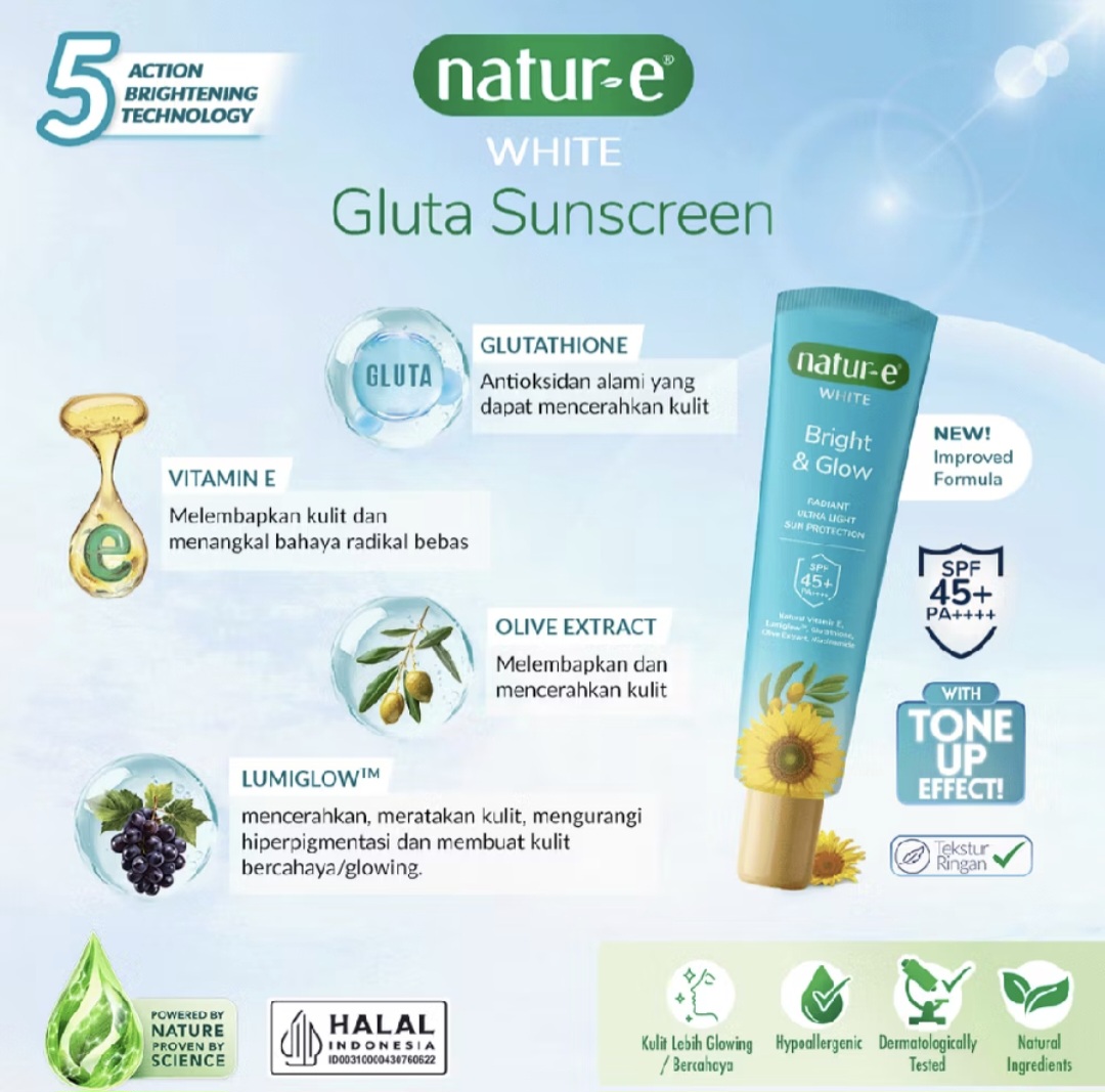 Natur-E White Ultra Light Sun Protection is a complete solution for caring for and protecting your skin from daily sun exposure. Enriched with Vitamin E, Glutathione, Sunflower Oil, Niacinamide, Lumiglow, and Arbutin, this product helps maintain moisture, nourishes, and strengthens the skin barrier.