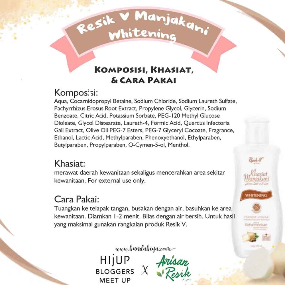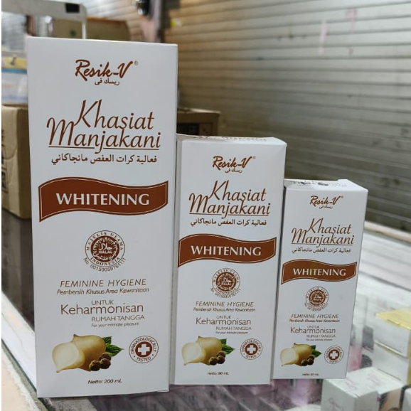 Resik V Efficacy of Manjakani Whitening is a feminine cleanser formulated with Manjakani and Jicama extracts to cleanse, reduce unpleasant odors, and help brighten the feminine area, especially around the groin. This product also helps maintain the health of the intimate organs by cleaning germs and bacteria that cause itching and vaginal discharge.