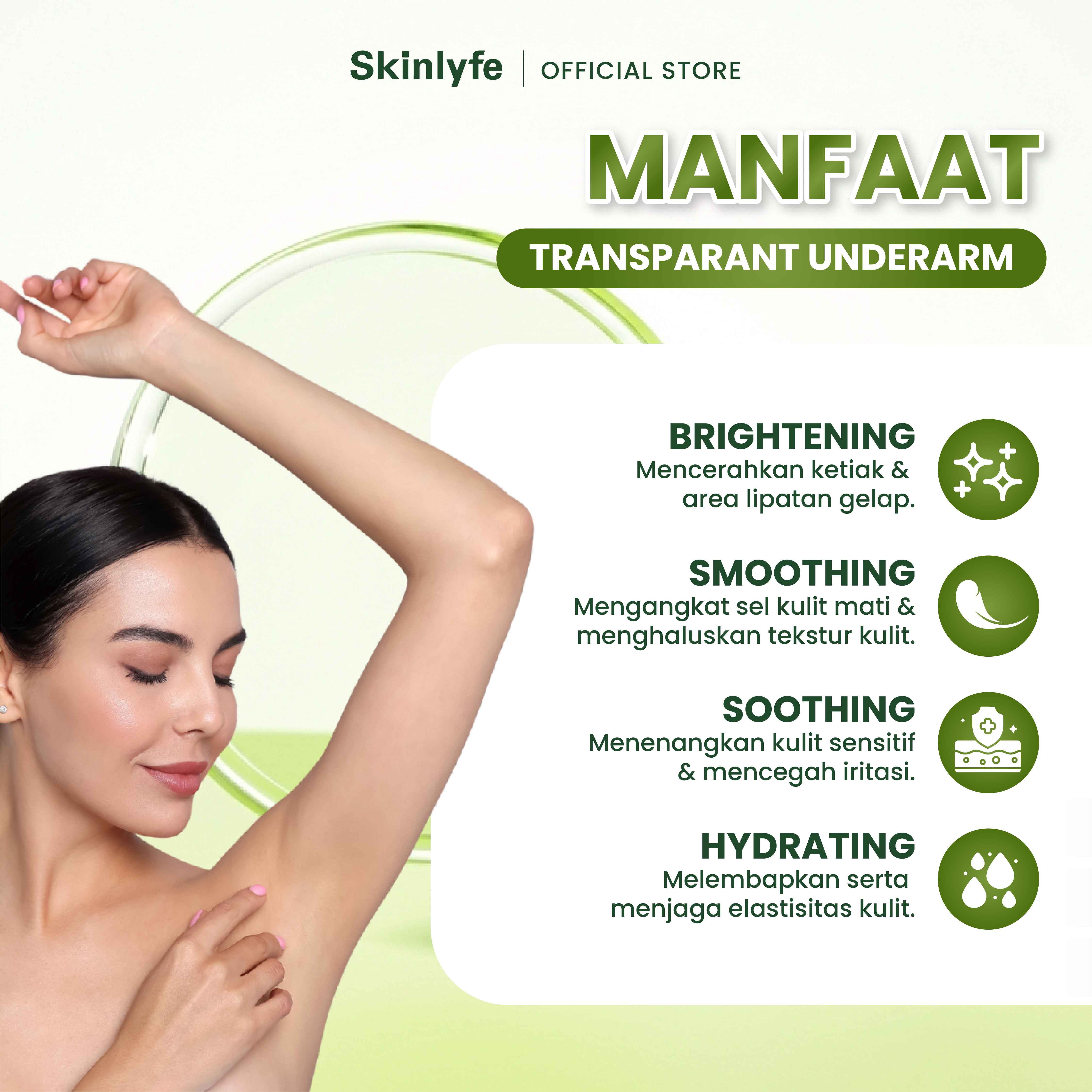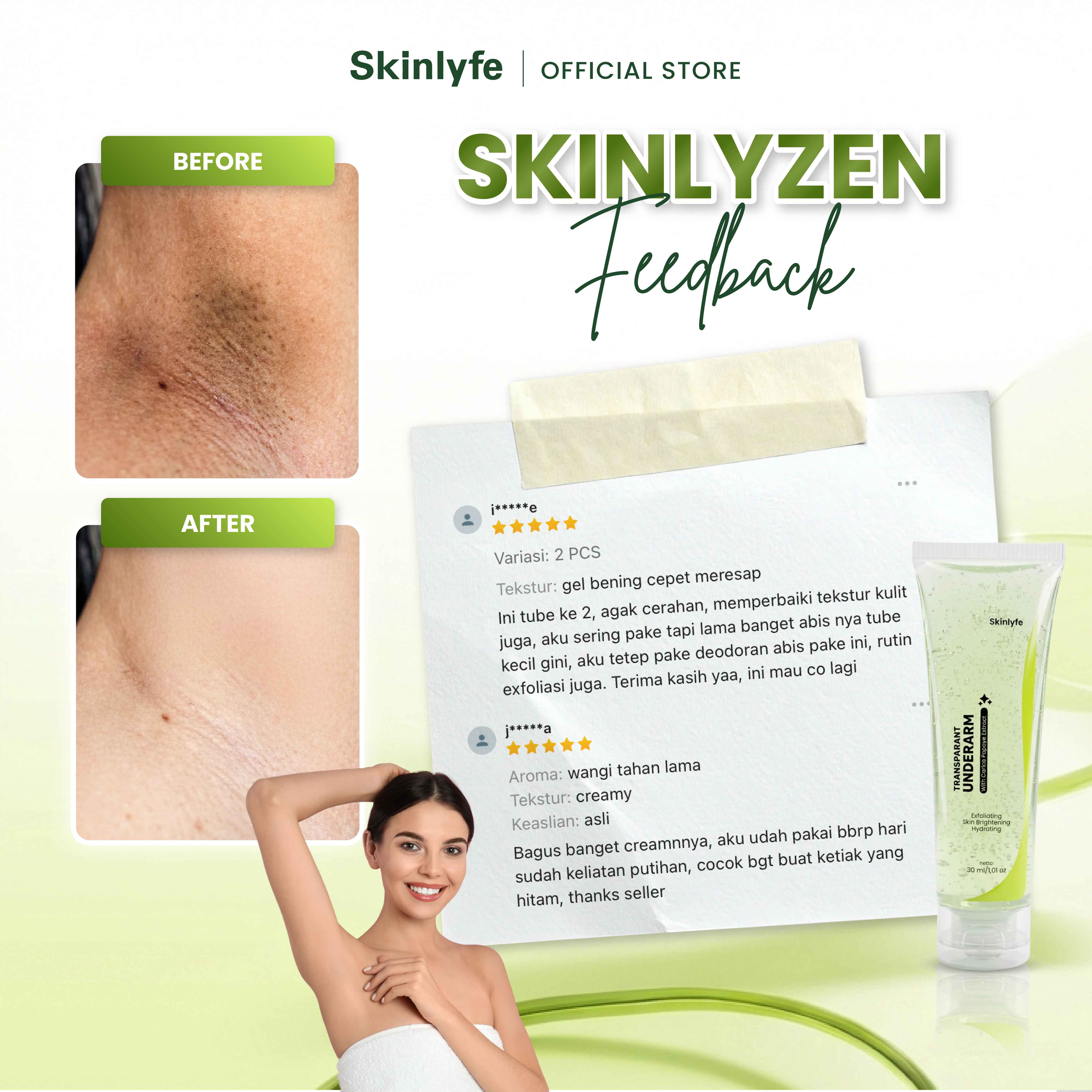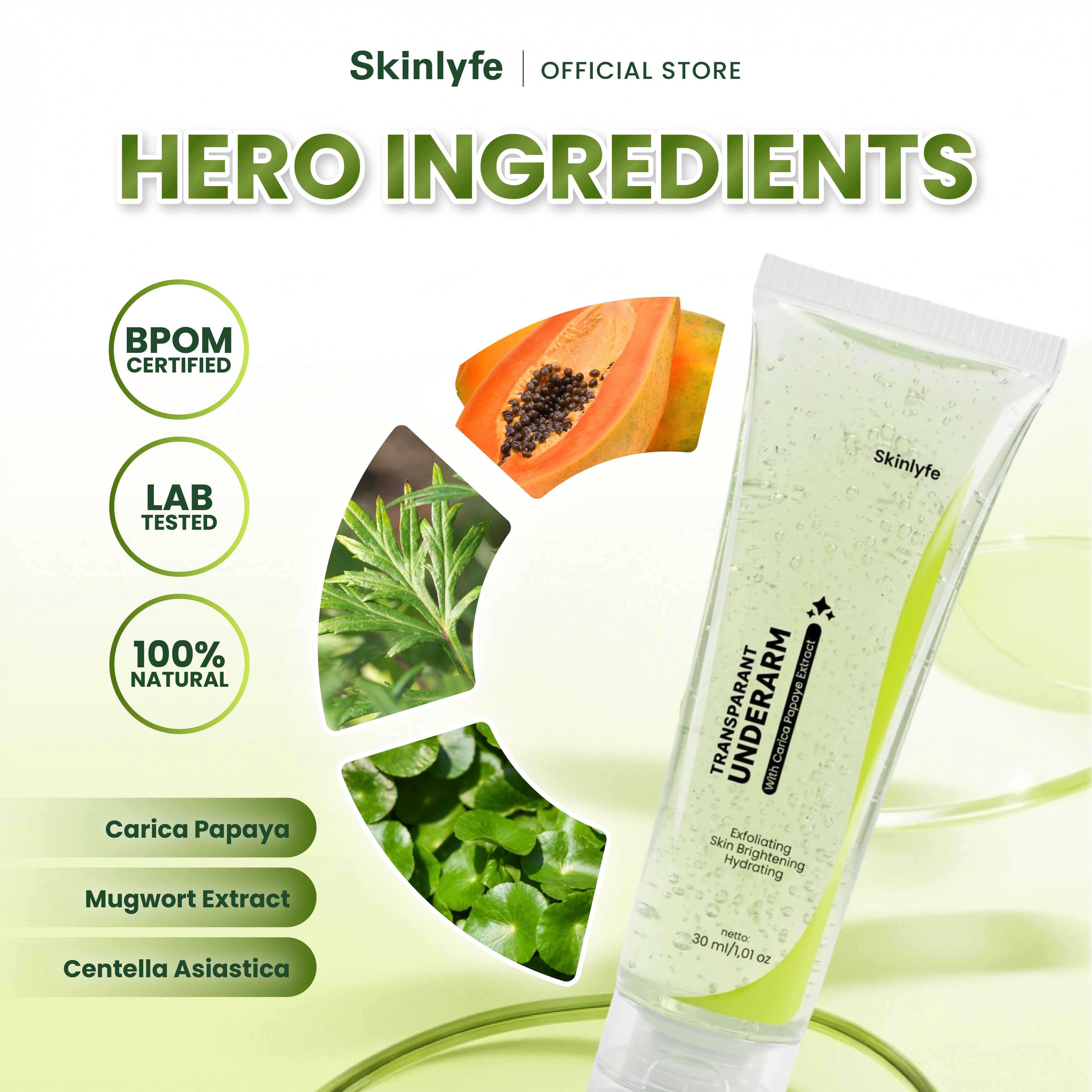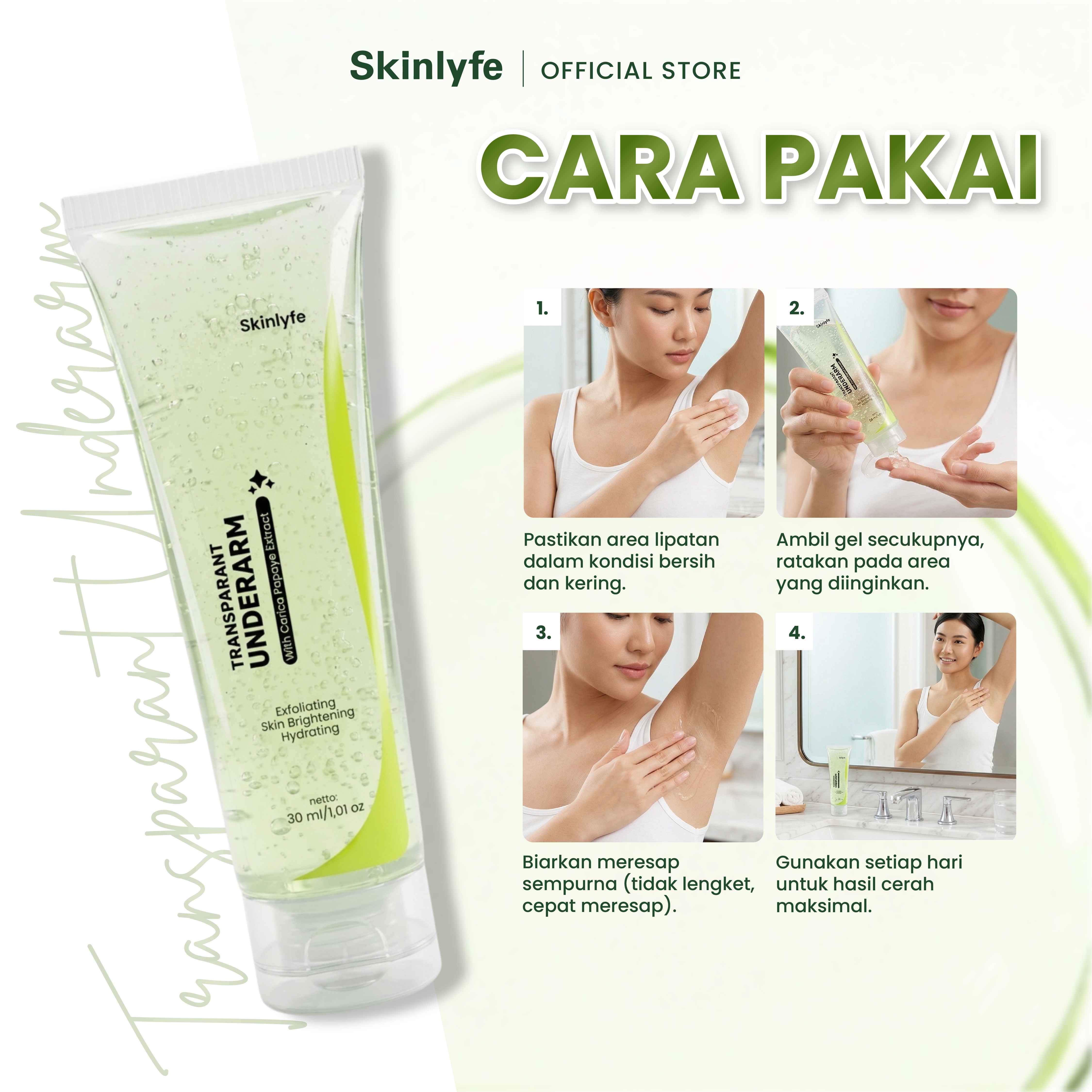Skinlyfe Transparent Underarm Gel is a treatment to lighten areas of the body folds such as armpits, groin, knees, elbows, and neck that are dull or darkened. Formulated with a combination of Papaya Extract, Licorice, Mugwort, and Centella Asiatica, this gel works effectively to remove dead skin cells, brighten skin tone, while soothing and moisturizing sensitive skin.