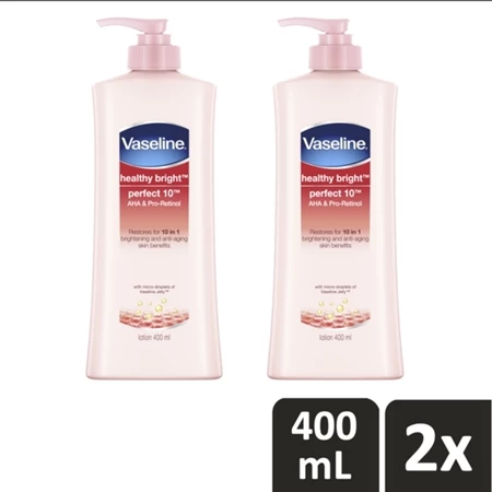 Vaseline� Healthy Bright Perfect 10 Hand Body Lotion (formerly Healthy White) is a skin care product containing AHA and Pro-Retinol which help the skin rejuvenation process, as well as safe ingredients such as natural Vitamin B3 which helps improve skin brightness. Triple sunscreens to block UVA and UVB rays to protect skin brightness from further damage. Enriched with micro droplets of Vaseline Jelly, the result is a lotion that provides moisture to help repair dark and damaged skin, making it brighter and younger looking. It is a skin care product that has 10 benefits: