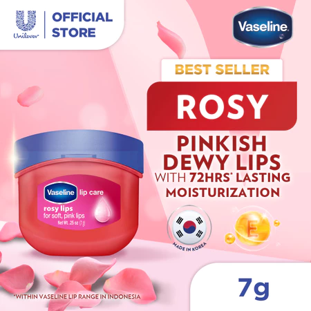 Vaseline Lip Therapy dari USA dengan kandungan Petroleum Jelly dan aroma Rosy yang memberikan kelembaban pada bibir. Gunakan setiap hari untuk mengurangi bibir kering dan pecah-pecah serta menjaga kesehatan bibir. Simpan ditempat sejuk dan hindari dari paparan matahari langsung. Jika terjadi iritasi pada bibir harap hentikan penggunaan produk.