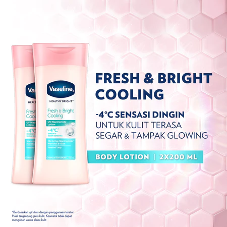 Vaseline Lotion Healthy Bright Fresh & Bright Cooling 100ml, kulit lebih cerah tanpa rasa lengket. Diperkaya menthol dan butiran mikro Vaseline Jelly yang berfungsi untuk mengembalikan kecerahan alami kulit dan sekaligus memberikan sensasi segar dan ringan sepanjang hari.