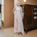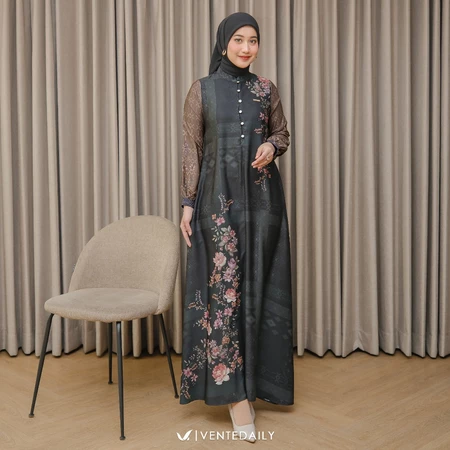 Gamis a sweet floral motif with a blend of harmonious colors creating a stylish appearance. The front button details are busui friendly with fine and cool material details throughout the day.