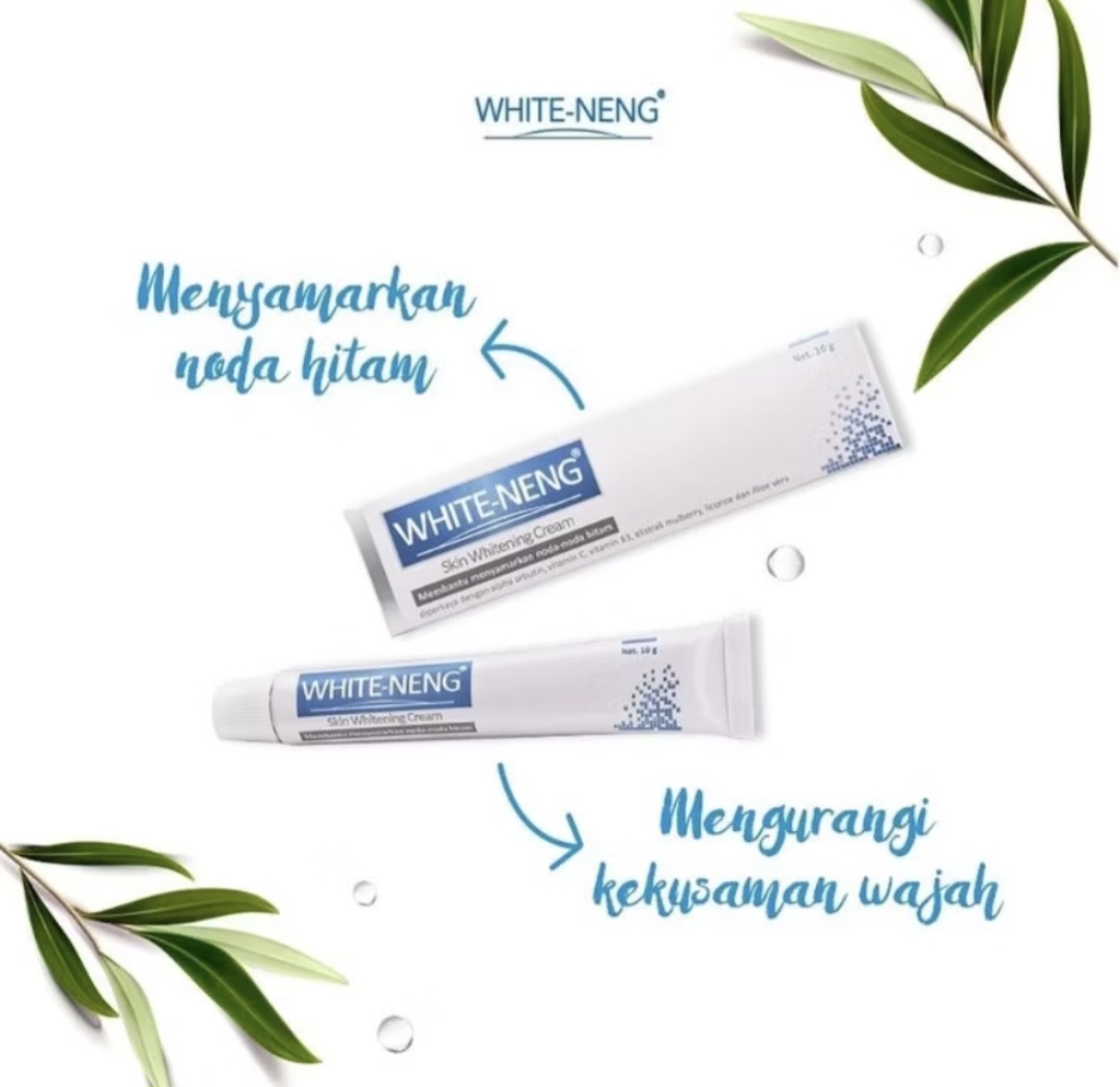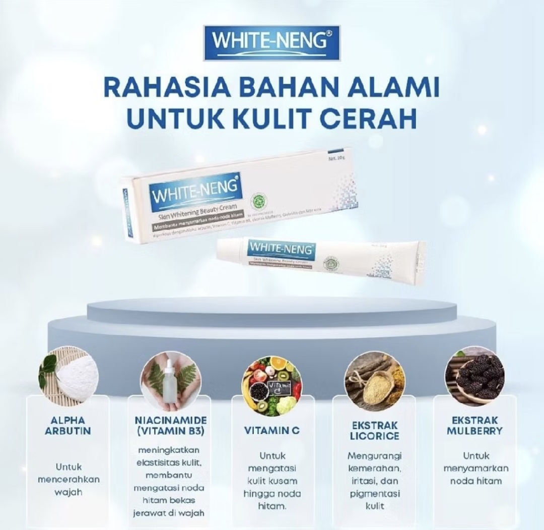 WHITE-NENG is a cream enriched with alpha arbutin, vitamin C, mulberry extract, licorice extract and niacinamide (vitamin B3) which can help reduce dullness and help disguise dark spots, as well as Aloe vera extract which can help moisturize the skin.